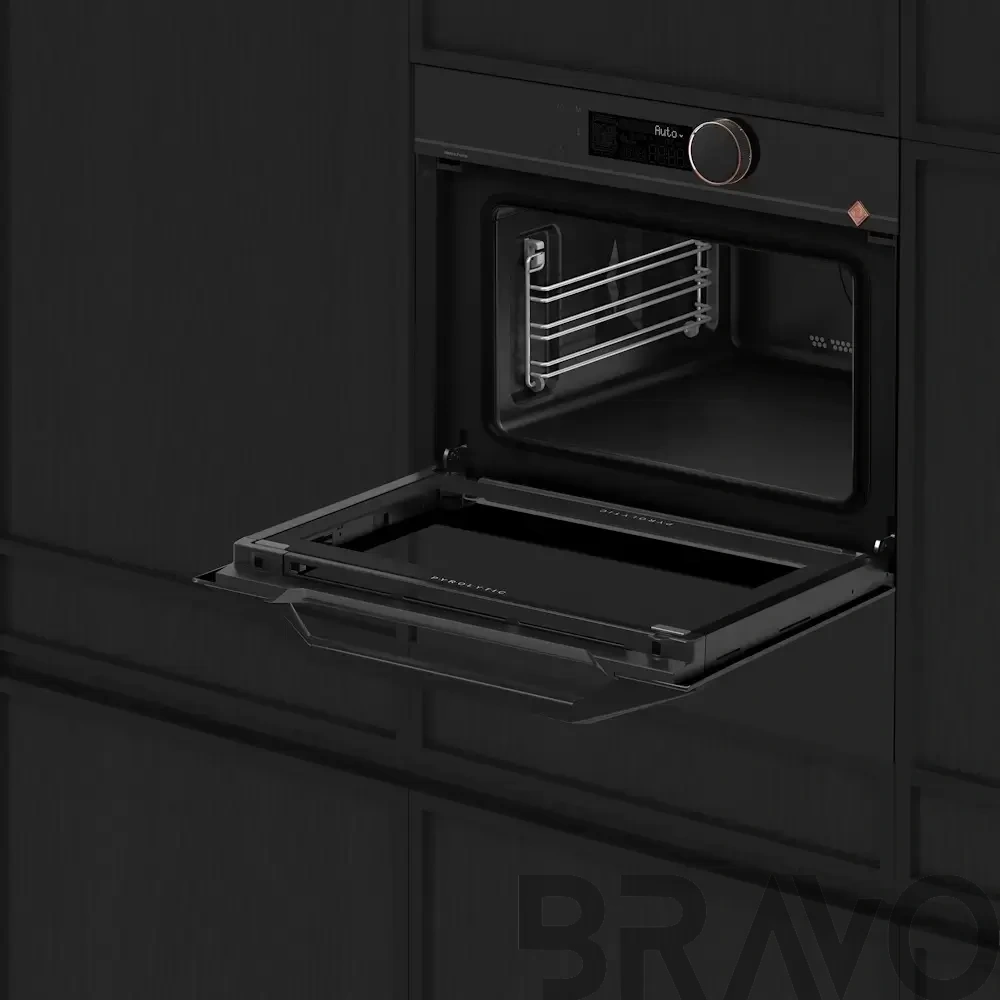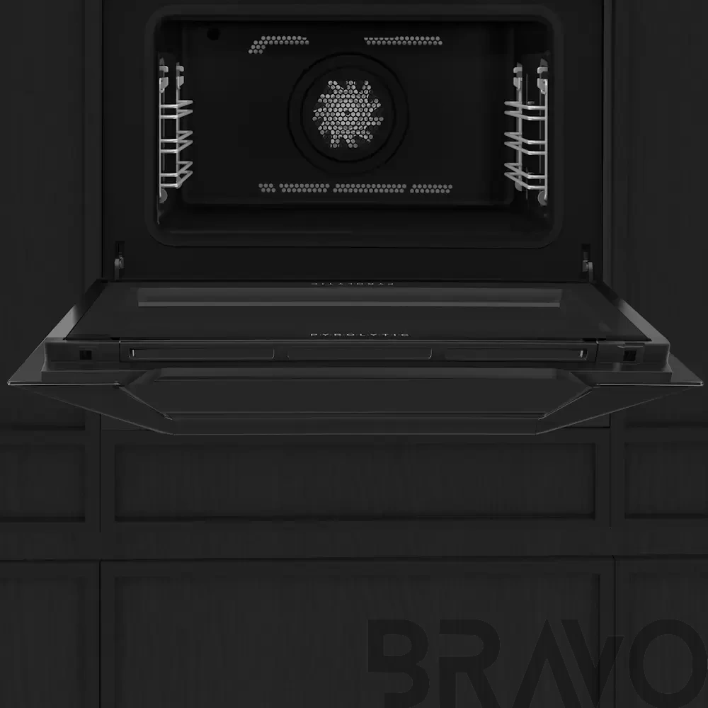 Особенности дизайна и внешней панели управления — также важный пункт при выборе духовки на кухню. В данной модели нужно обратить внимание на цвет — черный, охлаждение двери, чтобы поверхность и мебель вокруг не нагревались.