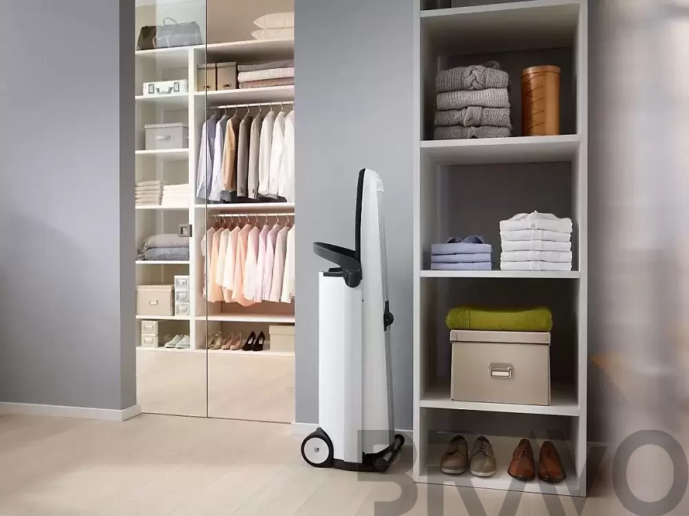 Система включает активный гладильный стол с функциями поддува и отвода пара, позволяющими наилучшим образом расправить одежду. При помощи отпаривателя можно гладить самые деликатные ткани и вещи со сложной отделкой. Режим парового удара поможет справиться с плохо разглаживаемыми вещами, например, из льна. Доску можно плавно отрегулировать по высоте в пределах от 83 до 102 см. Резервуар для воды легко снимается для заполнения. В сложенном виде система занимает совсем немного места, для хранения утюга предусмотрен специальные отсек. Удобные ролики при транспортировке не повреждают пол.