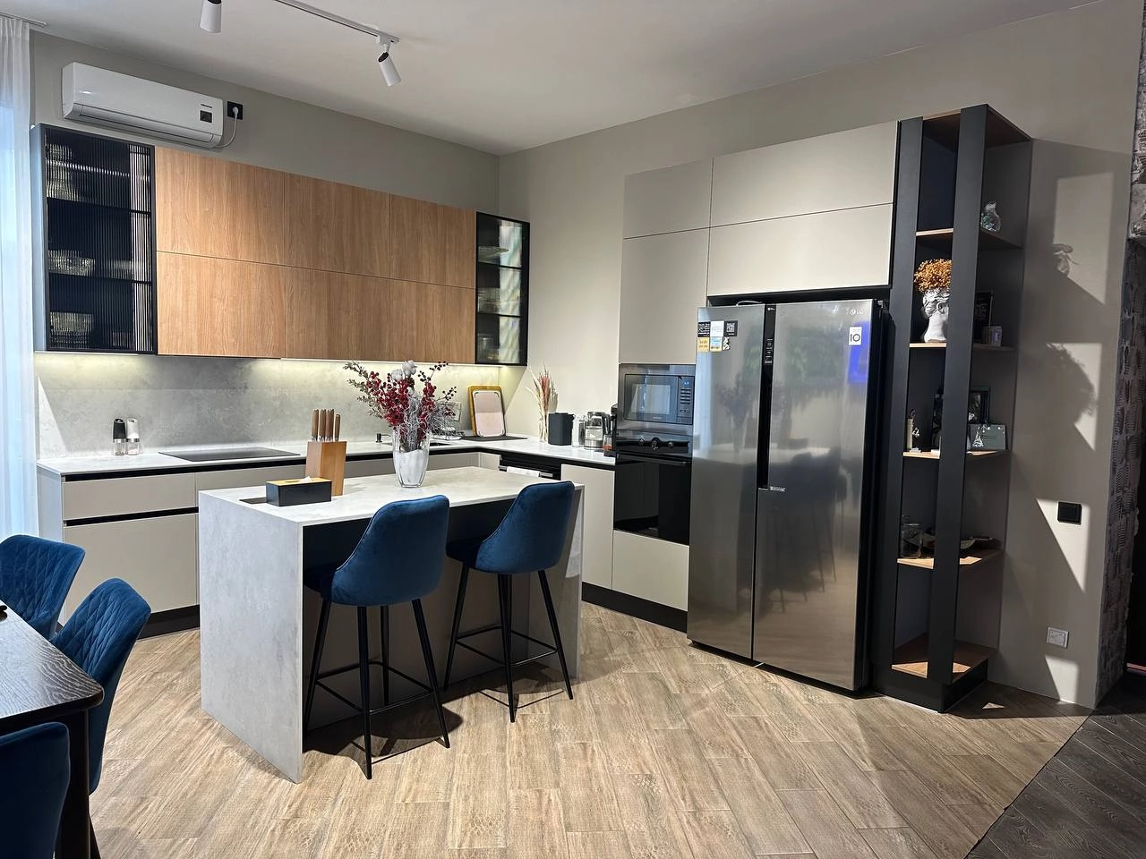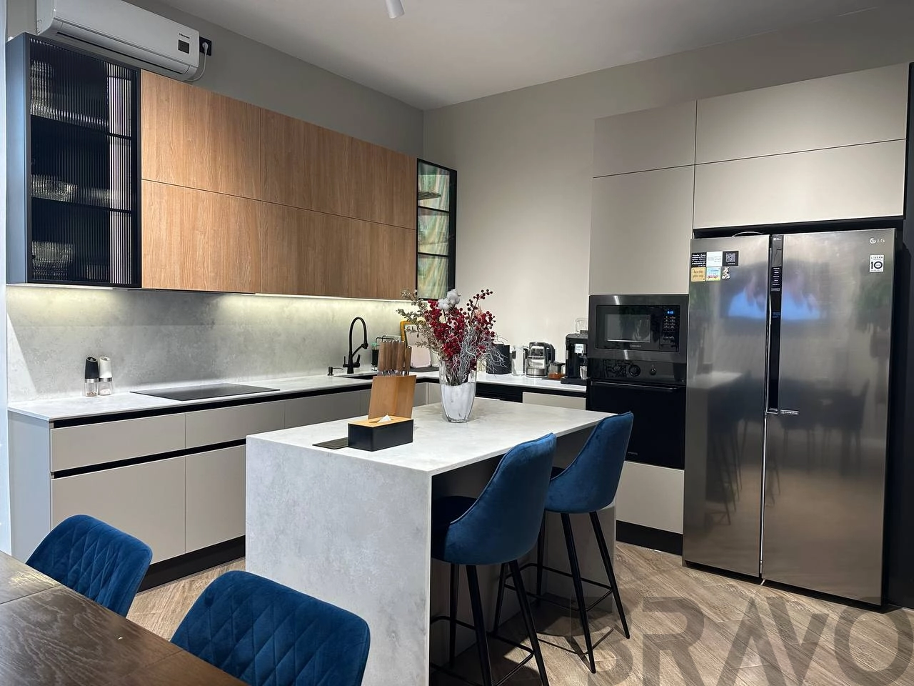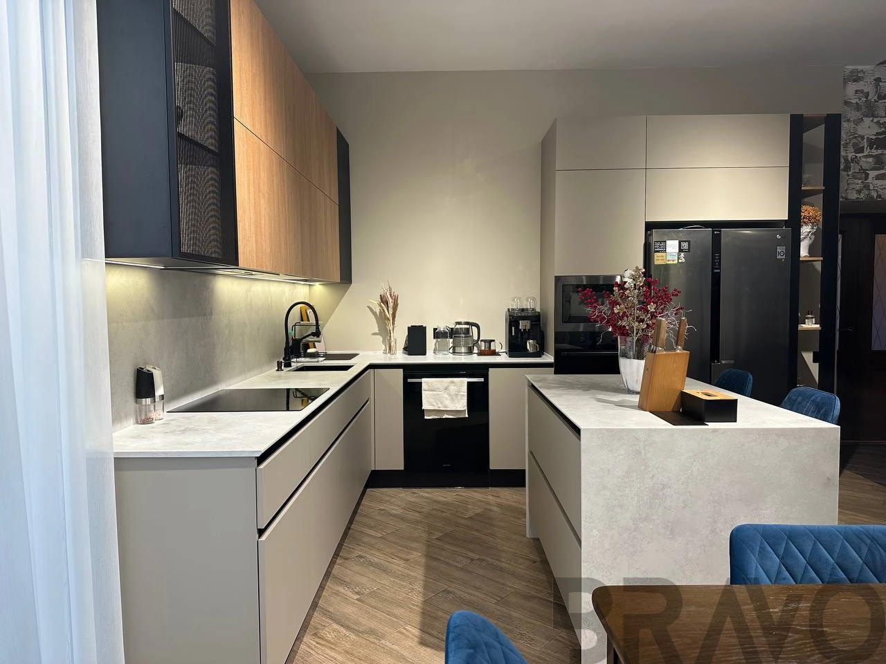 Фурнитура Blum, Boyard. Профиль Gola. Мойка и смеситель EMAR. Столешница и остров кварцевый агломерат Avant.